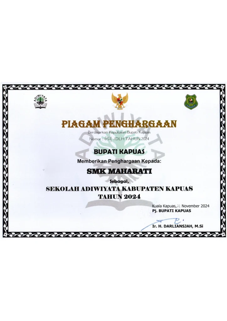 SMK Maharati berhasil meraih Sertifikat Adiwiyata tingkat Kabupaten ditahun 2024, sebagai bentuk komitmen terhadap kelestarian lingkungan. Program ini mendorong siswa untuk lebih peduli terhadap lingkungan melalui berbagai kegiatan hijau, seperti penghijauan, pengelolaan sampah, dan efisiensi energi. Pencapaian ini menjadi bukti bahwa SMK Maharati tidak hanya unggul dalam akademik, tetapi juga dalam membangun karakter peduli lingkungan bagi generasi mendatang.