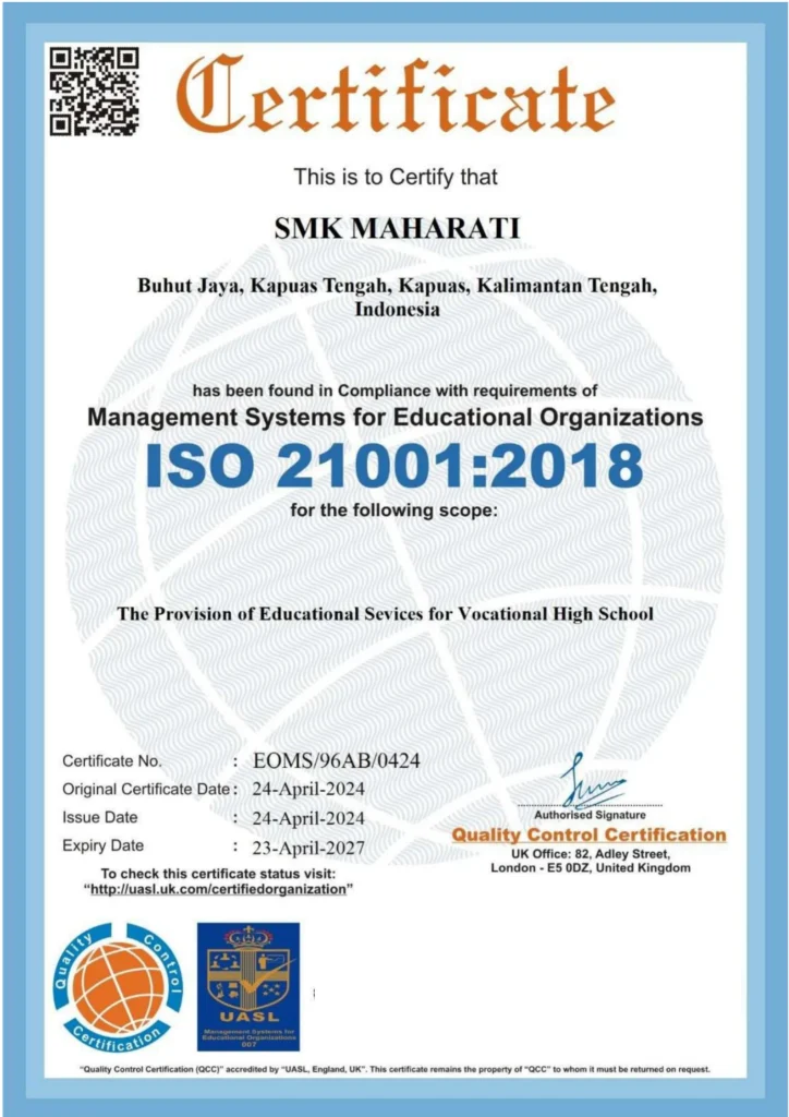 Sebagai sekolah yang terus berkomitmen dalam meningkatkan mutu pendidikan, SMK Maharati berhasil meraih sertifikasi ISO 21001:2018 pada tahun 2024. Standar ini memastikan bahwa sistem manajemen pendidikan yang diterapkan berjalan secara efektif, efisien, dan berorientasi pada kepuasan peserta didik. Dengan pencapaian ini, SMK Maharati semakin dipercaya oleh masyarakat sebagai institusi pendidikan yang unggul dan berkualitas.