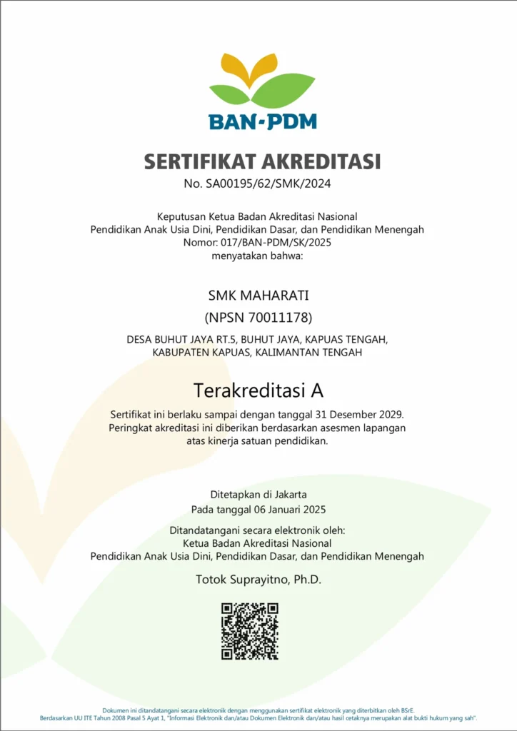 Pada tahun 2025, SMK Maharati meraih Akreditasi A dari BAN-PDM, mencerminkan kualitas pendidikan yang tinggi. Didukung oleh fasilitas pembelajaran yang sangat memadai dari Pama Grup, SMK Maharati mampu menyediakan lingkungan belajar yang optimal. Selain itu, kurikulum yang berbasis industri serta tenaga pengajar yang selalu mengikuti perkembangan dunia kerja menjadi faktor utama dalam pencapaian ini.